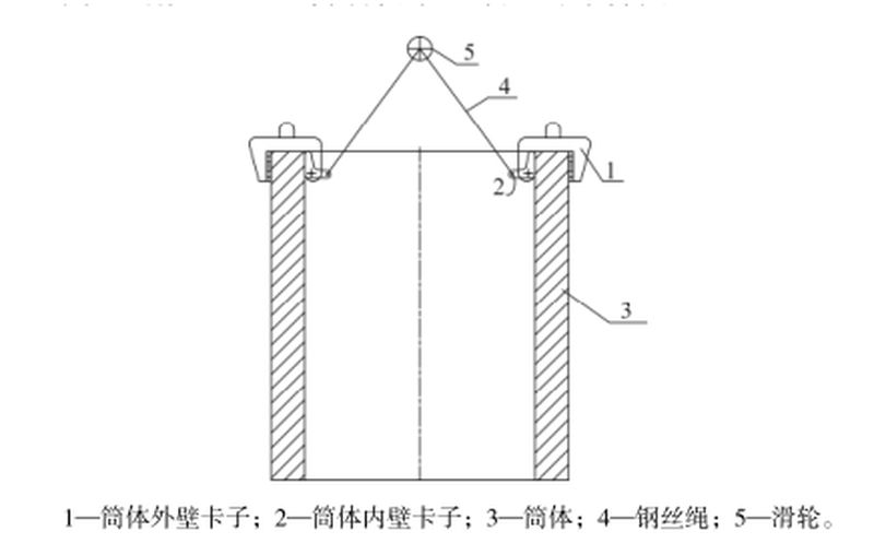 如下图所示,1与2采用螺栓连接,吊具A、B之间通过钢丝绳与动滑轮连接,在1和2的内侧面上堆焊锯齿台,锯齿台的高度为3~5mm,作用是为了增大1、2与筒体内、外壁的摩擦力。